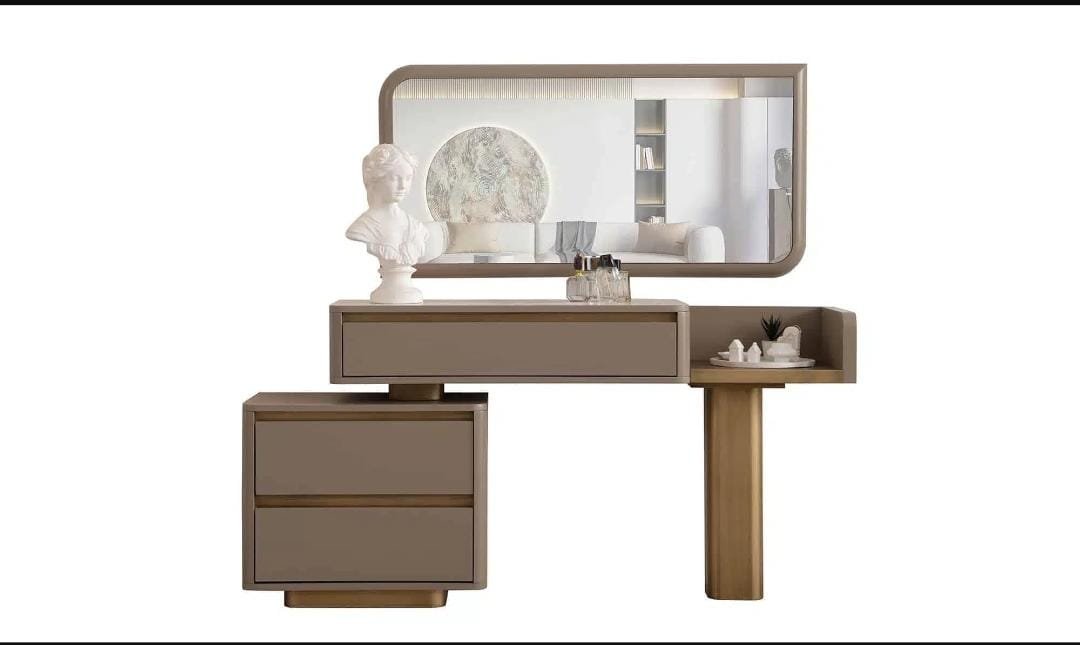 أضف لمسة دفء وأناقة إلى غرفة نومك مع تسريحة غرفة نوم مودرن بلون بني دافئ بتصميم عصري يجمع بين الجاذبية والعملية. يأتي هذا اللون البني الهادئ ليمنح الغرفة إحساسًا بالفخامة والراحة في الوقت نفسه، بينما يبرز التصميم البسيط والخطوط النظيفة الطابع المودرن الذي يناسب مختلف أنماط الديكور المعاصر في المنازل السعودية.