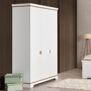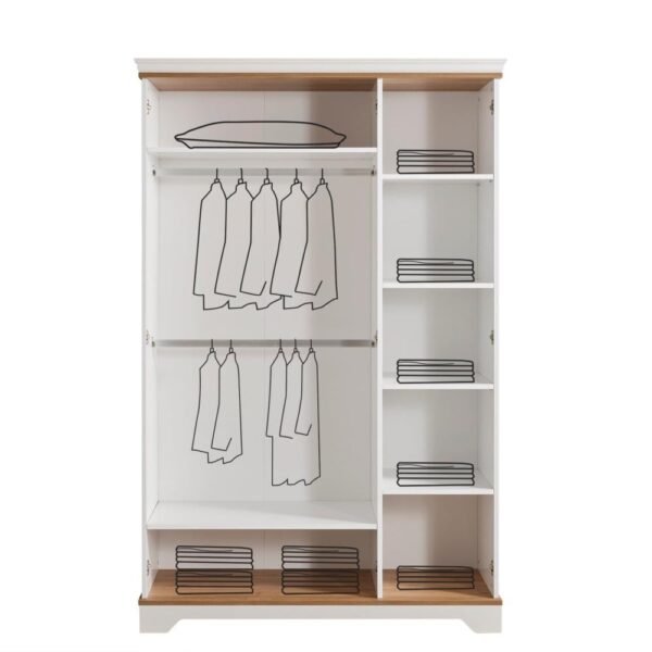 تحتوي الخزانة على ثلاث أبواب كبيرة، مصممة لتوفير وصول سهل ومريح إلى محتويات الخزانة. مع تفاصيل خشبية بارزة تعطي عمقًا وتفاصيل أنيقة.