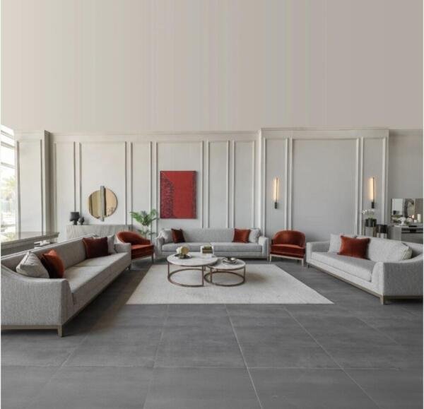 يجمع الطقم بين عدة قطع مختلفة (كنبة رباعية، ثلاثية، ثنائية، وكرسي مفرد) لتوفير أقصى درجات المرونة في تنسيق المساحة. اللون الرمادي يمنحه طابعاً عصرياً راقياً يسهل دمجه مع أنماط ديكور متعددة، بينما توفر الوسائد المريحة والقاعدة الخشبية المتينة تجربة جلوس فاخرة تدوم لسنوات طويلة.