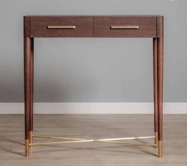 يتميز بسطح خشبي غني باللون البني الداكن مع درجين أنيقين لتخزين المفاتيح أو الإكسسوارات المنزلية، مما يوفر توازنًا مثاليًا بين الجمال والوظيفة.